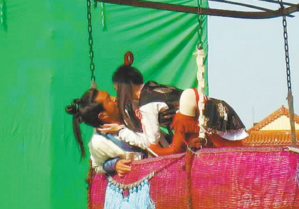 記者前往探班的一場戲,是該劇最后一幕:古天樂和大S經(jīng)歷種種波折終于走到了一起,在古天樂用風(fēng)箏和竹筐連成的“熱氣球”里度過浪漫時光。由于過于浪漫,大S演的俠女便起了“色心”,于是發(fā)生了強吻這一幕。