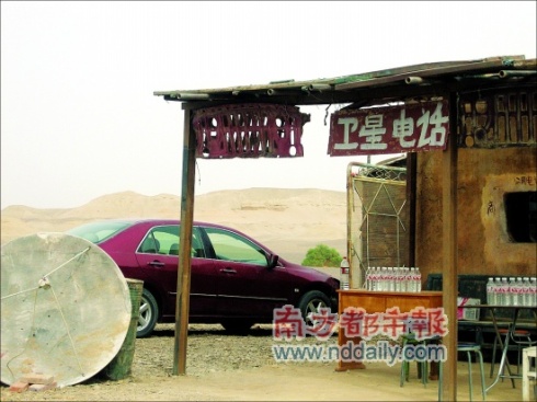 《無人區(qū)》的外景地是一個加油站兼小賣店,也做汽車修理生意。雖然這個外景地才搭建不足幾個月,但在黃沙狂風(fēng)的洗禮下,已經(jīng)活像一個存在了幾十年的破爛地方。連小賣店本身也是一個無頂?shù)男“,每?dāng)風(fēng)吹過,無盡的黃沙就朝人的頭頂撒下。