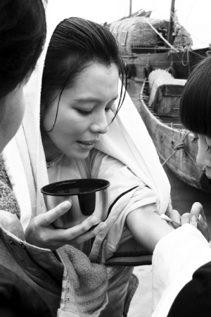 徐若瑄介紹,她扮演的黃蘇英是個美麗善良,而又堅韌不拔的漁家女,看到孩子的同學(xué)不慎掉入水中,她當即跳海救人。拍攝當天,海邊的天氣十分寒冷,天空下著雨,海風(fēng)很大,導(dǎo)演為她的身體狀況擔心不已!拔視斡,但因為要和小演員配合,所以要在海水中一遍遍試戲,很耗體力,后來我的腿都在抽筋了!北M管劇組提前準備了充足的保暖和安全措施,上岸后的徐若王宣仍凍得瑟瑟發(fā)抖,幾盡虛脫狀態(tài),長時間無法緩解過來!瘘S笑宇
