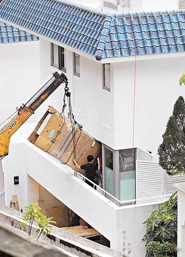 請來起重機將冰箱吊入新居。