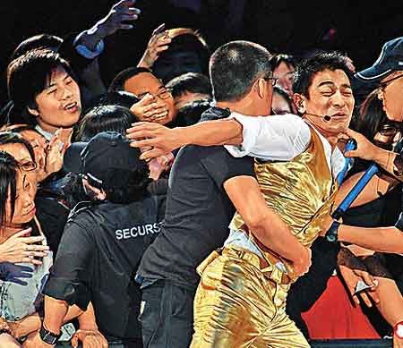 甫開唱,在臺下的Twins即不停為華仔打氣,當華仔走近與Twins握手時,更擁抱她們。由于歌迷十分期待與華仔近距離接觸,所以當他在演出期間走近觀眾席,觀眾都會拉不放手,到握手時,觀眾就更瘋狂,華仔前晚幾乎被歌迷拉跌倒,幸好保安眼明手快上前保護他,他才得以脫身。