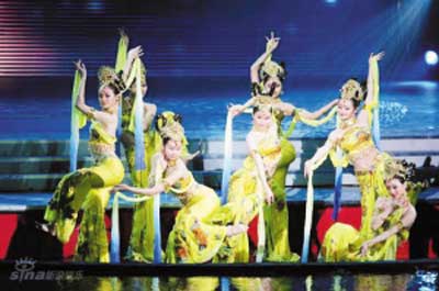 在今年春晚上,舞蹈《飛天》引人關(guān)注:七名仙女打扮的舞蹈演員站在升降舞臺上,用肢體配合音樂演繹出敦煌壁畫中的飛天形象,配合著舞臺上飄落的花瓣和臺下噴涌而出的水花,一起將觀眾引入“仙境”。