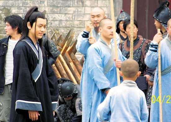 在劇里演青年皇帝的林志穎是前天下午才進(jìn)劇組的。昨天中午他拍的是與元彪率領(lǐng)的少林十八僧沖出洛陽城門的一場(chǎng)戲。說是一場(chǎng)戲,記者在現(xiàn)場(chǎng)看到,其實(shí)也不過是幾分鐘左右的鏡頭——從“洛陽”城門徐徐打開,到一臉凜然的眾僧與林志穎抄著長棍短棒從里沖出來,然后在城門口一個(gè)亮相的定格。就這么一個(gè)場(chǎng)景,來來回回折騰了大約有一個(gè)多小時(shí):城門開了,沖!重來!城門再開,再?zèng)_!還是不行,再跑!