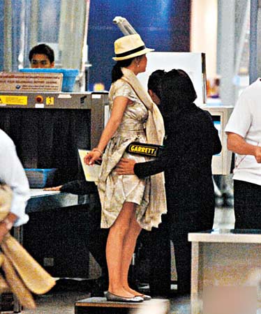 劉嘉玲和梁朝偉昨日凌晨由曼谷機場轉(zhuǎn)飛不丹,臨上機前二人如普通旅客一般,要經(jīng)過金屬探測機測試,未料嘉玲過關時竟發(fā)出BB聲響,女關員即上前一手拿 金屬探測儀器,一手摸嘉玲腰胸搜身,而嘉玲非常合作,自動脫掉帽子,挺直腰板任由女關員檢查,最后安然過關開心上機。