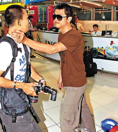昨日,王菲拖兩歲小女兒李嫣、大女竇靖童和丈夫李亞鵬到達(dá)曼谷機(jī)場時,李亞鵬因不滿傳媒追訪妻女,尤其他為力保與王菲所生的兩歲兔唇小女兒李嫣的芳容,突然動手打記者。