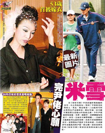 《家好月圓》的一幫演員聽聞米雪要嫁尹志強的消息后,紛紛提早道賀。“Jo鮑”夏雨祝兩人白頭到老,家好月圓。與米雪私交甚篤的馬海倫,除了連聲叫好外,還失口爆料:“據(jù)我所知,他們會低調(diào)搞。”