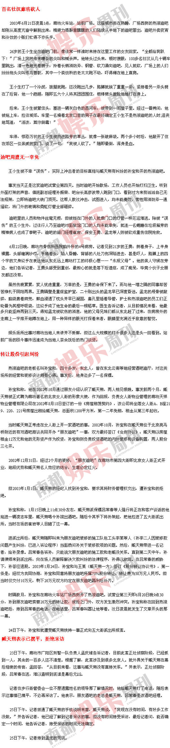 2003年的我正供職于京城某家在市場(chǎng)上享有盛譽(yù)的報(bào)社。那年夏天,孫寶和找到報(bào)社,拿了一大堆文字資料和現(xiàn)場(chǎng)照片,聲稱自己遭黑社會(huì)迫害,幕后主謀就是歌星臧天朔。當(dāng)時(shí)報(bào)社在異地采訪問(wèn)題上一直相當(dāng)慎重,但沒(méi)想到很快就得到領(lǐng)導(dǎo)的充分許可。我和另一名攝影記者連夜趕往廊坊進(jìn)行了一周多的調(diào)查。令我深感意外的是,這么大動(dòng)靜的毆斗居然沒(méi)有第二家媒體介入,更談不上披露問(wèn)題,相關(guān)的細(xì)節(jié)和猜想也僅在群眾中間悄然流傳,我們成了惟一到現(xiàn)場(chǎng)采訪的記者。