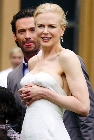 也許是太過(guò)放松,妮可·基德曼在向影迷們揮手致意的時(shí)候,身上穿的白色露肩晚禮服竟然悄然下滑,令其胸部走光,她驚覺(jué)后趕緊雙手護(hù)胸。