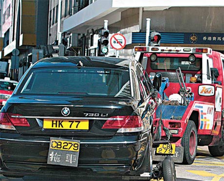 掛上紀(jì)念朱玲玲當(dāng)選港姐年份HK77車牌的寶馬,昨日也被拖車拖到寶馬車廠。