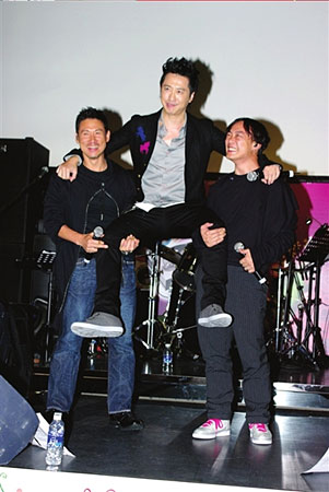 發(fā)布會(huì)現(xiàn)場(chǎng),心情不錯(cuò)的庾澄慶經(jīng)常大笑得前仰后合,張學(xué)友和陳奕迅更是讓他興奮不已。兩位好哥們兒送上大包的零食,祝福庾澄慶在香港更加“吃得開”。在哥兒仨開唱之前,張學(xué)友特別提醒眾人:“請(qǐng)大家注意歌詞!扁壮螒c哭笑不得地唱起了《愛你的只有一個(gè)我》,張學(xué)友和陳奕迅一邊和聲一邊搞笑地伴舞。拍合影的時(shí)候,張學(xué)友和陳奕迅合力把站在中間的庾澄慶扛上肩膀,張學(xué)友還不忘問道:“這下心情好很多了吧?”再三被追問如何對(duì)待妻子伊能靜的“外遇”,庾澄慶說:“處理完之后會(huì)告訴大家的!敝劣谑欠駬(dān)心這個(gè)時(shí)候推出新碟會(huì)被質(zhì)疑借機(jī)炒作,庾澄慶表示:“我不會(huì)拿家里的事情做新聞點(diǎn),更何況這件事情很重要。如果我不工作把自己關(guān)在家里,就是很好的解決方式嗎?不是! 記者 朱雅清