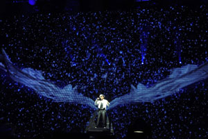 華仔昨晚除了載歌載舞,間中還穿插魔術(shù)秀、音樂劇等,其中音樂劇環(huán)節(jié),他就找來2位辣妹dancers共舞,左擁右抱,又貼身熱舞,又緊緊抱在一起;魔術(shù)秀環(huán)節(jié),還認(rèn)女助手為“女朋友”,羨煞現(xiàn)場(chǎng)所有女歌迷!
