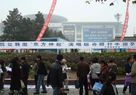 中新網(wǎng)12月26日電 近日,一篇題為《東方神起武漢演唱會(huì)前夕遭現(xiàn)場(chǎng)抵制》的帖子熱傳國(guó)內(nèi)各大網(wǎng)站論壇,該帖一出即引發(fā)大量網(wǎng)友口水戰(zhàn)。文章說,2008年12月20日,來自武漢三鎮(zhèn)的志愿者在武漢會(huì)展中心地區(qū),就“東方神起”針對(duì)中國(guó)女性的暴力行為發(fā)動(dòng)簽名抗議,志愿者高舉“抗議韓國(guó)‘東方神起’演唱組合毆打中國(guó)孕婦”條幅,呼吁市民積極參與此次抵制活動(dòng)。雖然到目前為止,整件“毆打孕婦”事情的真?zhèn)涡赃沒有一個(gè)官方的說法,但網(wǎng)友這種自發(fā)的行為還是吸引了大量的觀望著,甚至有眾多路人在條幅上簽名表示支持。