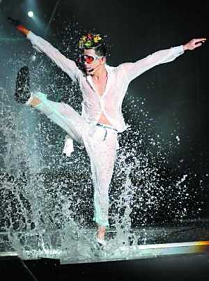 作為系列演唱會(huì)的保留項(xiàng)目,這次水花舞林表演環(huán)節(jié)賦予不少新的東西,首先是首次在T臺(tái)上表演,更加拉近與觀眾的距離;其次是前晚的氣溫只有10℃,在如此低溫的環(huán)境下“玩水”會(huì)令人更加興奮。在緩緩的流水聲中,整個(gè)舞臺(tái)被注滿了水,像一個(gè)巨型水池。在《唱這歌》的音樂聲中,身穿白色全套透視裝的郭富城現(xiàn)身跳起勁舞,水花一直濺射到臺(tái)下,觀眾也很興奮地迎水而舞,郭富城的紅色防水內(nèi)褲也都完全展露出來,盡顯誘惑味道。而最后演唱《著迷》的時(shí)候,郭富城更用毛巾拍打舞臺(tái)的水,產(chǎn)生更多水花,將觀眾的熱情推向高潮。