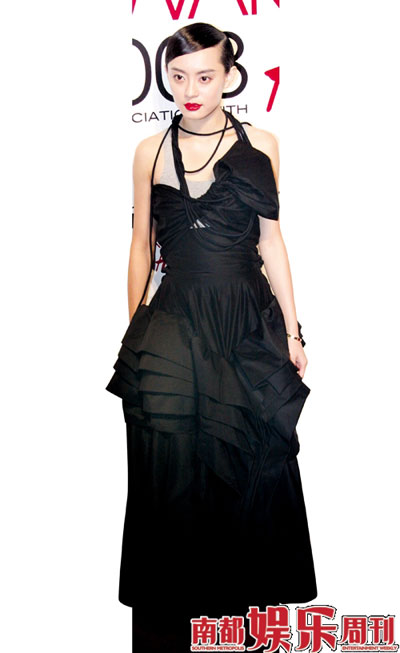 她出現(xiàn)的時候,腳下有一條電線,令人忍不住聯(lián)想這與她領(lǐng)子上那幾條可疑的細帶有什么關(guān)系。她面無表情,猶如蠟像館的人偶,也許她被勒著了。裙子也許很好看,但孫儷并不喜歡,她在裙子里配了一件白色的BRA,這種搭配叫做:當純情女星遇上性感裙子。
