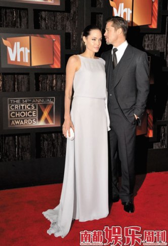 自從兩人生孩子后,感情有增無減,朱莉的這身白色曳地長裙如希臘女神般優(yōu)雅,彼特只要站著當當甘草,兩人就是最般配的一對。