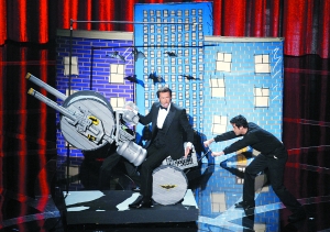 之后杰克曼開嗓大飆一連串的歌秀舞,巧妙把今年入圍的大熱門影片融合布景全唱進(jìn)歌里。首先,他在《貧民富翁》的急智問答布景前笑唱“好萊塢有最多一夜致富的故事”,接著又融合《蝙蝠俠:黑暗騎士》、《本杰明·巴頓奇事》、《朗讀者》電影情節(jié)大秀舞蹈,最后則走下臺抱起安妮·海瑟薇,兩人上臺模仿電影《對話尼克松》的一問一答、搞笑共舞。