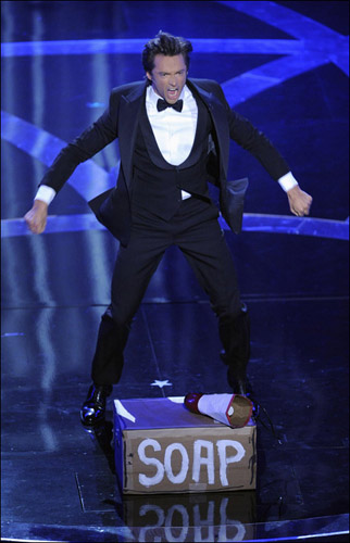 杰克曼最出彩的表現(xiàn)集中在與碧昂斯共舞的橋段。杰克曼與穿著性感的碧昂絲以及《媽媽咪呀》的主演阿曼達(dá)一起模仿《芝加哥》《紅磨坊》《發(fā)膠》以及《媽媽咪呀》等片的經(jīng)典橋段,精彩的舞蹈表演將頒獎(jiǎng)典禮的氣氛推向高潮。