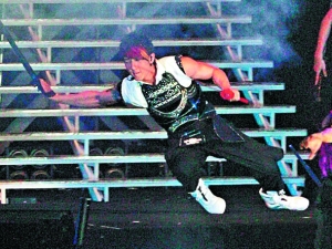 飛輪海首次踏上香港紅館舉行演唱會,可惜2月27日的首場演出就錯漏百出。汪東城(大東)撞毀圍欄險些跌下臺;炎亞綸自彈自唱跟不上節(jié)奏;吳尊用單手吊鋼絲飛入場時跌傷腳,表演耍劍時又弄斷了劍,以致辰亦儒取笑他說:“每次彩排都覺得很危險,他的功力一天比一天強!辈贿^,歌迷對此照單全收,從開場到結尾都接近失控狀態(tài),不停瘋狂叫囂支持偶像。演唱會結束時,歌迷才發(fā)現吳尊爸爸也在現場,立刻蜂擁而上爭相合照。據悉,吳尊的傷勢不輕,演唱會結束后他在工作人員陪同下到醫(yī)院照X光檢查,發(fā)現左腳跟骨裂,估計要兩個月才能愈合,故他兩星期內不可跳舞及跑動。