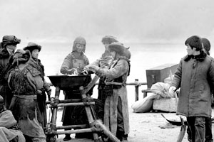 記者昨日在現(xiàn)場(chǎng)看到,每當(dāng)拍戲的間歇,演員們就三五成群地圍到行軍火盆旁邊烤火、聊天。還有的演員扭在一起摔跤,以運(yùn)動(dòng)來增加熱量。