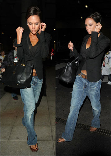 當(dāng)天的維多利亞·貝克漢姆身穿黑色西裝外套,里面則是搭配了黑色露臍抹胸,下面穿了肥大的牛仔褲,小編驚奇的發(fā)現(xiàn),維多利亞居然當(dāng)天沒(méi)有穿高跟鞋,而是換了平底的拖鞋,很是少見(jiàn),難道貝嫂轉(zhuǎn)性啦??? 但是連高跟鞋都可以脫掉的貝嫂絕對(duì)不變的就是那張黑臉了。