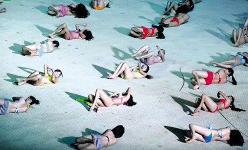 “印象沙灘”是整場(chǎng)演出中最“養(yǎng)眼”的一幕。剛開始,兩個(gè)穿著短裙的姑娘跑到舞臺(tái)中央,一陣狂舞之后,兩人突然豪放地當(dāng)著全場(chǎng)觀眾的面,脫下短裙,露出性感的三點(diǎn)式泳衣。觀眾還來不及驚呼,更多的三點(diǎn)式美女出現(xiàn)了,先是十幾個(gè),后來是上百個(gè)……滿場(chǎng)都是!她們朝著觀眾席大喊:“我們是海南島的姑娘!我們很年輕!我們很漂亮!” ……