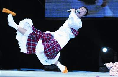 經(jīng)過近2小時(shí)的“溫場”后,小沈陽終于壓軸登臺(tái)亮相。一看到身穿標(biāo)志性的紅格子“蘇格蘭”服,背著小挎包的小沈陽從后臺(tái)走出來時(shí),觀眾紛紛尖叫著起立。久候在舞臺(tái)邊的一群女粉絲手捧鮮花,欲沖過保安防線上前獻(xiàn)給偶像!皩(duì)我的粉絲要客氣哦!”小沈陽金口一開,粉絲們立即突破了防線沖上臺(tái)去,有女粉絲獻(xiàn)過花后再來一個(gè)熊抱,后面的女粉絲更是“搶吻”小沈陽,“陽仔(小沈陽小名)我愛你”的真情表白更在劇場內(nèi)此起彼伏,看來小沈陽的“女人緣”極好。