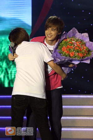 此次重回“福地”的王櫟鑫,與現(xiàn)場(chǎng)歌迷大玩游戲,不但與觀眾互動(dòng)演繹了一出《劉?抽浴,更與歌迷親密合唱了一首《天生一對(duì)》,頗為搞怪的舞姿、多變的表情令現(xiàn)場(chǎng)氣氛更為火爆。和李易峰一樣,王櫟鑫也遭遇了熱情粉絲的大熊抱。