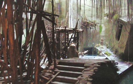 洞內(nèi)燈火通明,卻很陰冷潮濕,時(shí)不時(shí)聽(tīng)到滴滴答答的水聲,十幾個(gè)工人正在忙碌著趕制道具。一位工人師傅告訴記者,“我們已經(jīng)在這里忙活兩個(gè)月了,洞內(nèi)的所有木頭橋、破房子、還有垂掛下來(lái)的藤條等等,全是人工打造的。”