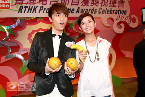蔡卓妍(阿Sa)、張敬軒6日為港臺(tái)獲獎(jiǎng)祝捷會(huì)擔(dān)任頒獎(jiǎng)嘉賓,會(huì)上公布0八至0九年度獲得的七十七個(gè)國(guó)際及本地電視獎(jiǎng)項(xiàng);顒(dòng)后,阿Sa與軒仔影合照,軒仔拿著兩個(gè)大木瓜遞給阿Sa,并笑說(shuō):“以形補(bǔ)形!
