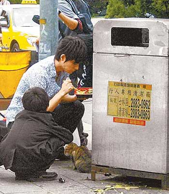 中新網(wǎng)10月18日電 周渝民(仔仔)昨為新戲《在這里等你》在臺灣拍外景,他近來常被傳得憂郁癥,精神狀況總被人大作文章,昨記者目擊仔仔肚子餓了,直接蹲在垃圾桶旁邊吃便當(dāng),吃得津津有味,剩下的剩菜也沒浪費,分給流浪貓吃,十分有愛心。接著精神奕奕與女主角關(guān)穎對戲。
