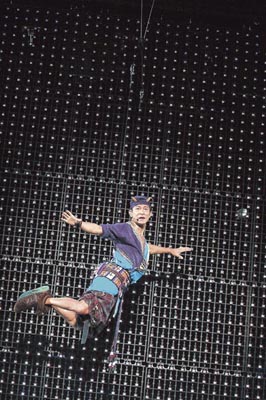 演唱會進行期間,華仔唱《愛你一萬年》時吊鋼絲于半空表演360度轉圈動作,但他轉得太大力而失去平衡,華仔試圖用腳扣著鋼絲穩(wěn)定身體,但反被鋼絲纏腳倒吊半空,臺下歌迷嚇得驚叫,幸好最后他安然無恙落地。其后他與女舞蹈員在臺邊跳舞,不慎被公仔撞到險墮臺,女舞蹈員及時拉住他才沒事。