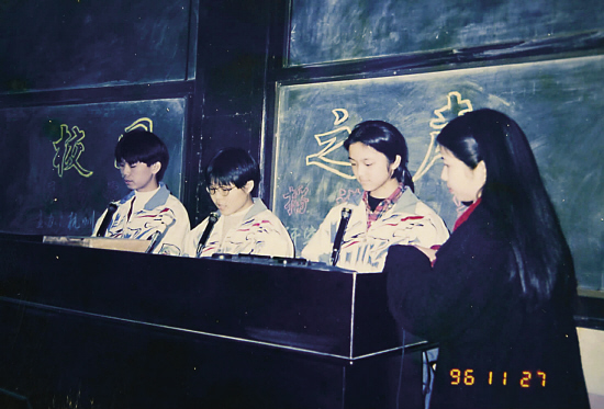 湯唯是班長,又是語文課代表,藝術(shù)天賦很早就表現(xiàn)出來了。1996年11月27日,湯唯與另外兩名同學代表學校參加校園之聲職高學生播音比賽,還獲了獎!八芟矚g各種文藝方面的活動,每次的主題班會都是湯唯與副班長一起主持策劃的。”說到這班主任肖老師很開心,“只要有她在,我什么都不用操心,只要坐在底下聽就好。她是個很用功的學生。湯唯普通話說得很好,學校的活動很多都是她主持的!