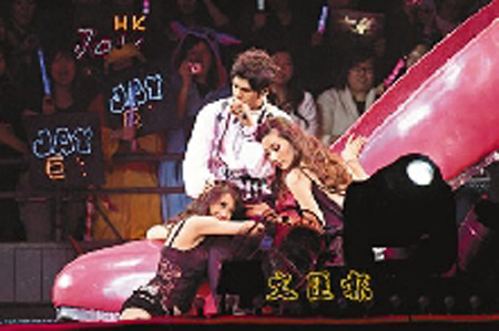 據(jù)香港文匯報(bào)報(bào)道,“周杰倫2007世界巡回演唱會(huì)”香港站的七場(chǎng)演出已于前晚大功告成,周杰倫獻(xiàn)唱《夜曲》時(shí),名模姚書軼和另一性感舞蹈員從旁伴舞,她們不停做出誘惑動(dòng)作,不僅掃摸他身體,更甚是伸手在周杰倫的大腿內(nèi)側(cè)位置掃過去,差點(diǎn)觸及周杰倫重要部位,周杰倫被嚇得用手撥開對(duì)方。最搞笑是立刻以手掩護(hù)住下,可能周杰倫給熱情的女伴舞者所帶動(dòng),隨之開放起來,當(dāng)女伴舞者把頭躺在周杰倫的大腿時(shí),他索性把對(duì)方的頭按下,差點(diǎn)觸碰到下體,令現(xiàn)場(chǎng)觀眾叫囂不絕。