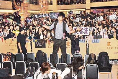 中新網(wǎng)12月27日電 羅志祥(小豬)昨午由臺(tái)灣抵港,出席下午在將軍澳新都城商場(chǎng)舉行的簽唱會(huì),約三十名“粉絲”接機(jī),雖然步出機(jī)場(chǎng)時(shí)面露疲態(tài),但出席簽唱會(huì)時(shí),小豬馬上又充足電,且十分親民,跟Fans抱抱之余,大合照時(shí)還舉起Fans自制的牌合照,還輕觸Fans玉手,逗得全場(chǎng)瘋狂大叫。簽唱會(huì)吸引近千人圍觀,場(chǎng)面熱鬧!