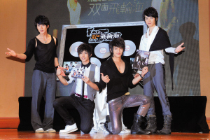 超人氣組合飛輪海將于今天全亞洲發(fā)行他們的第二張專輯《雙面飛輪!罚蛉账麄兏跋愀叟e行亞洲記者會招待會。雖然人氣超高,但他們?yōu)榱诉@張新專輯的宣傳依然非常賣力,連一向惜肉如金的吳尊也來了一個“胸”前大解放,以透視裝露點出席記者會。