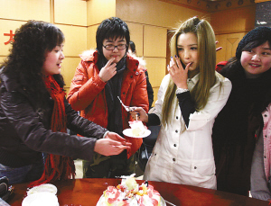 自超女比賽結(jié)束后,何潔的話題新聞就源源不斷:頒獎禮上摔倒、跪著接受采訪、機場昏倒、出車禍……儼然成了“話題女王”。昨日下午,她作客本報與山城“盒飯”歡聚一堂,坦然表示歡迎大家問“負面新聞”,還親手為“盒飯”切蛋糕。