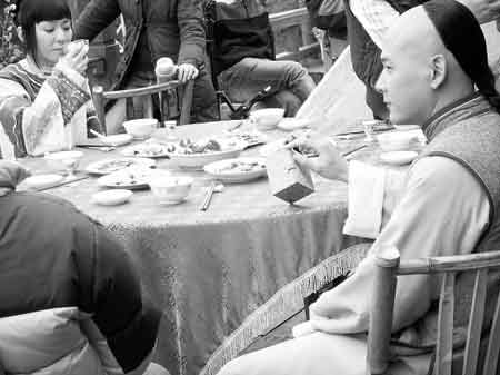 “這是我們的主菜掌上明珠!背弥膽虻目諜n,演“金寶”的英俊小生邱心志當(dāng)起了“跑堂”,給記者介紹起菜來(lái)。戲中的明爭(zhēng)暗斗都在餐桌旁,于是,這桌菜成了重要的道具。記者發(fā)現(xiàn),這些菜還是實(shí)打?qū)嵉恼娌。在這桌菜邊上一坐幾個(gè)小時(shí),還不能動(dòng)筷子,無(wú)聊時(shí),邱心志就把戲里的另一個(gè)道具——裝印章的盒子放在桌子上來(lái)回玩耍,像個(gè)雜技演員。