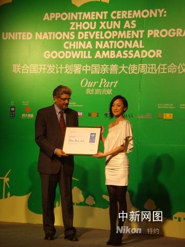 中新社北京四月二十一日電(記者 阮煜琳)聯(lián)合國開發(fā)計(jì)劃署今天北京宣布,任命著名藝人周迅為首位聯(lián)合國開發(fā)計(jì)劃署中國親善大使,致力于推動(dòng)環(huán)境的可持續(xù)發(fā)展。