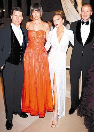 本屆展覽的主題是“超級(jí)英雄:時(shí)尚與夢(mèng)幻”。參加如此隆重的時(shí)尚活動(dòng),明星們想必都要挖空心思讓自己成為當(dāng)晚的焦點(diǎn)。然而當(dāng)晚紅毯上最令人大跌眼鏡的明星,卻是素來(lái)頗受人推崇的阿湯嫂凱蒂和貝嫂維多利亞。維多利亞向來(lái)都知道如何在人前搶鏡,一件阿瑪尼的白色透明長(zhǎng)袍的確令在場(chǎng)的攝影師對(duì)她一陣狂拍。只不過(guò)維多利亞臉上厚重的粉底,沉悶的發(fā)型,加上她不茍言笑的表情,一下子顯得她老了許多,甚至給人一種上世紀(jì)60年代明星的錯(cuò)覺(jué)。不知是否因?yàn)槭芰素惿┑挠绊,阿湯嫂?dāng)晚也玩起了復(fù)古。一件橘色的裹胸禮服顯得她又黑又瘦,腳上那雙藍(lán)色高跟鞋更是不知所謂,凱蒂這一身打扮顯得身邊的老公又比她矬了幾分。