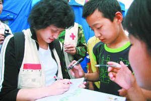 對于震區(qū)的孩子們來說,如何克服緊張和恐懼,如何擺脫不好的記憶,如何能夠在今后健康的成長是最重要的,也是高敏和心理醫(yī)生此行的主要目的。在每個孩子都介紹了自己的名字之后,高敏又讓每一個孩子都介紹三個自己認(rèn)為自己擁有的優(yōu)點(diǎn)。她又身體力行地說:“我認(rèn)為我的眼睛大,走到哪里都愛笑,能夠帶給別人快樂,最后我擅長跳水!痹谒膸酉,每個小朋友都非常自豪地向所有人介紹自己的優(yōu)點(diǎn)!拔遗艿每臁薄ⅰ拔覕(shù)學(xué)好”、“我特別有禮貌”……“小朋友們,你們知道奧運(yùn)賽場上每個人都非常緊張,都好怕,但是為什么我能夠成為最后的冠軍嗎?”高敏說,“小朋友說因?yàn)椤孕、拼搏和?jiān)強(qiáng)’。你們說的都對,但是僅僅這些是不夠的,你要比別人再做得好一點(diǎn)。這依靠的是平時每一天超越自己!备呙襞e例告訴現(xiàn)場每一個小朋友,如果他們每天寫100個字就到達(dá)了極限,那么就努力讓自己再多寫10個,這樣到了關(guān)鍵的時候,才能夠真正地爆發(fā)出常人所沒有的力量!俺阶约。這是我昨天上課的主題。”高敏說,“和他們在一起時間過得真快。離開之前,我給我的學(xué)生們留下了一句話!髳蹮o形,真愛不死,愛的路上,你們永遠(yuǎn)不孤單!’”