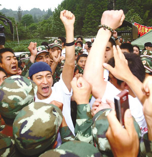 經(jīng)過兩個小時的車程,劉德華一行抵達了向峨鄉(xiāng)的救援部隊駐地。得知劉德華等人要來,數(shù)千戰(zhàn)士已在那里等候?吹矫餍牵届o的現(xiàn)場沸騰起來。為了維持秩序,士兵們自覺地手拉手圍成一個圈,把明星們圍在里面。