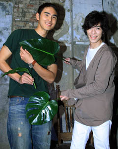 阮經(jīng)天(左)為蕭敬騰跨刀拍MV,蕭敬騰搞笑送海芋葉。