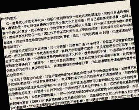 “八卦天王”還在信中向外界透露,自己就是林志玲遭遇“咸豬手”幕后的“真兇”。他稱,在林志玲到訪臺科技大學演講那天,他只是出于對偶像的愛慕之情,想接觸一下偶像并和她握手,由于太多人圍堵林志玲,所以他僅在人群中伸手摸到林志玲手臂,并非網(wǎng)上所傳聞的敏感部位。