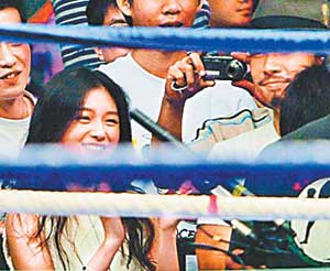 當(dāng)晚,與大S一起的還有黑人、范瑋琪等。大S和吳建豪坐隔壁,大S不時鼓掌叫好,并高舉雙手加油,吳建豪則拿相機拍照,還看得瞠目結(jié)舌。比賽結(jié)束,大S趴在擂臺邊,望著臺上的壯漢,要吳建豪幫她和猛男合照,2人和拳手握手后,才心滿意足并肩離去。