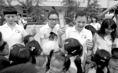 這支明星隊(duì)伍很特別:除了劉孜以外,其余都是年輕媽媽,因此特別要求探望災(zāi)區(qū)的小朋友們。一行人早上8點(diǎn)半從成都出發(fā),接近中午時(shí)才抵達(dá)梓潼的兒童福利院。孫莉和黃磊的女兒多多已經(jīng)快2歲半了,看到這些天真無(wú)邪的孩子,孫莉特別心疼,一個(gè)勁兒地往他們手里塞各種小禮物。而很久沒(méi)出來(lái)唱歌的陳明,還自己掏錢給孩子們買了好多彩色橡皮泥。在永安小學(xué)陳明借來(lái)一個(gè)擴(kuò)音喇叭,汗流浹背地唱起那首《快樂(lè)老家》。今天,愛心媽媽們還將前往德陽(yáng)的兒童福利院繼續(xù)她們的“獻(xiàn)愛行動(dòng)”。(記者 喬雪陽(yáng) 攝影 楊剛)