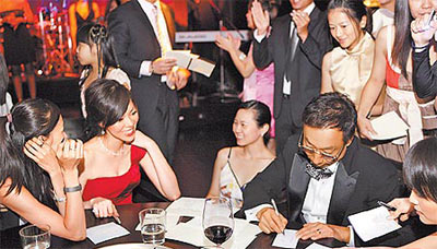 幫忙拍照的攝影師問郭臺(tái)銘:“要不要休息一下?”還建議一大群人拍合照,不要單獨(dú)拍,但郭臺(tái)銘婉拒,還是一一與賓客拍照,給足曾馨瑩面子,賓客拿出邀請(qǐng)卡請(qǐng)郭臺(tái)銘簽名,他來者不拒,現(xiàn)場(chǎng)宛若簽名會(huì),由于燈光昏暗,飯店服務(wù)生還拿小手電筒幫他照明。他戴上老花眼鏡簽名,還細(xì)心寫上祝福話,老公如此貼心,曾馨瑩心疼又開心,臉上始終掛著笑。