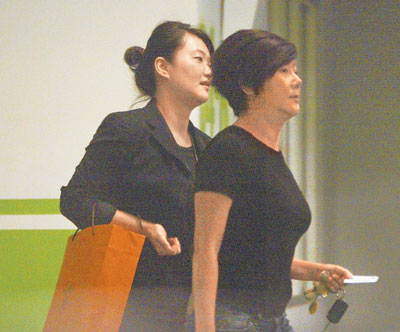 藍(lán)心湄(右)取車(chē)時(shí)有專(zhuān)人負(fù)責(zé)提袋,側(cè)面觀察她小腹凸出。