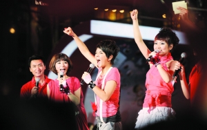 前日是北京奧運(yùn)開賽首日,陳燮霞和龐偉分別在女子舉重48公斤級(jí)和男子十米氣手槍決賽中奪得金牌。為此,可口可樂昨晚在世貿(mào)天街廣場(chǎng)舉行慶祝中國(guó)首日奪金的儀式,成龍、S.H.E都出席并與市民一起分享了喜悅心情。當(dāng)大屏幕上回放陳燮霞奪金的瞬間時(shí),S.H.E三人忍不住在臺(tái)上歡呼雀躍?赡苁切那樘^激動(dòng),三人現(xiàn)場(chǎng)演唱第一曲《中國(guó)話》時(shí),竟然有點(diǎn)走調(diào)。