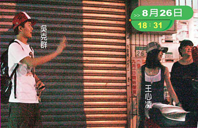 吳克群和提著大包小包的助理上車,之后又接了公司同事,三人一同來(lái)到八德路四段一間錄音室。十分鐘后,戴著白色棒球帽、個(gè)頭嬌小的王心凌,忽然出現(xiàn)在錄音室門口,悄悄進(jìn)門。在錄音室待到晚上六點(diǎn)半,吳克群和王心凌先后走出來(lái),在門口先和同事道別,接著兩人和助理一同坐上吳克群的休旅車,驅(qū)車前往慶城街的一家餐廳。