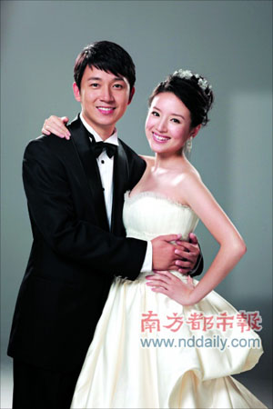 董潔和潘粵明一中一西的兩款結(jié)婚照,都是喜氣洋洋。